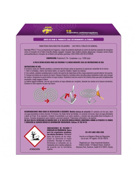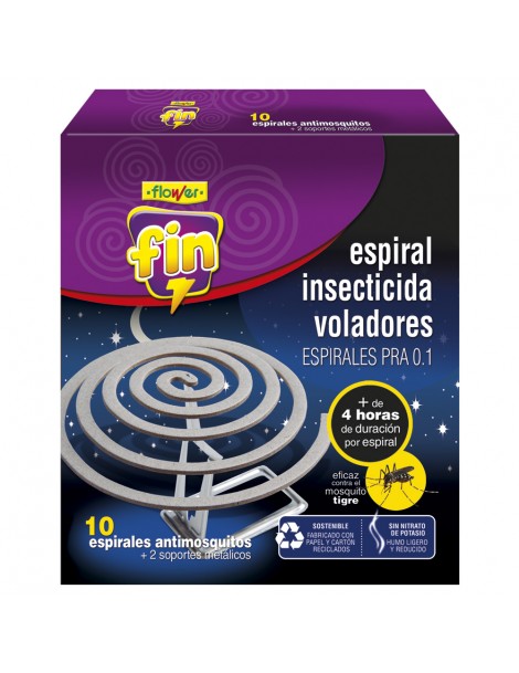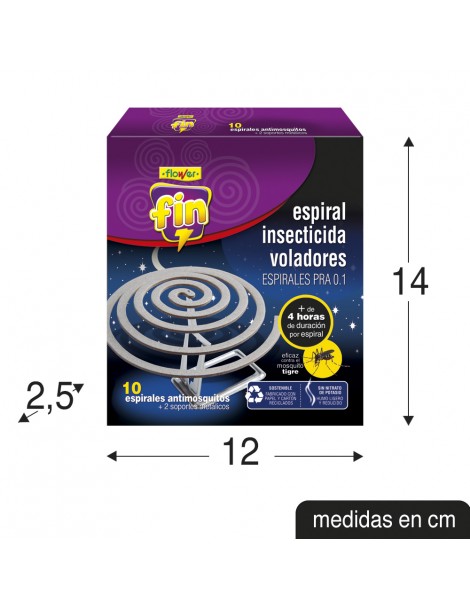 Caja con 10 espirales y 2 soportes metálicos contra mosquitos y otros insectos voladores en espacios exteriores. Máxima eficacia caracterizada por su rapidez de actuación. Tiene una duración de 6 horas, no se apaga con el viento y es eficiente contra todo tipo de voladores, incluido el mosquito tigre. Está fabricado con fibras naturales ecológicas, desprende un aroma muy agradable y no precisa de fragancias añadidas.